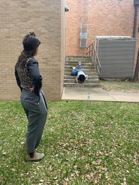 In March of 2024, Spector and the students viewed Cinthia Marcelle’s Confrontation (Unus Mundus Series), which depicts numerous fire jugglers performing in the crosswalk of a busy Brazilian intersection. “It sparked a great conversation,” Spector recalled, “Its vantage point, evoking a red-light camera or surveillance footage, became a point of entry to discussing camera perspective and how point-of-view shapes our subconscious understanding of an action. The piece is also a useful example of a performance captured on video rather than a video performance, a distinction that helps students see different ways performance can be enacted, documented, and circulated.”